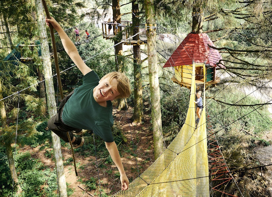 The park is divided into different themed areas, each with challenges and adventures for all ages. Younger children can discover secret tunnels, green mazes and sensory zones, while the more adventurous can climb on elevated platforms, jump from heights or traverse giant nets suspended between trees.